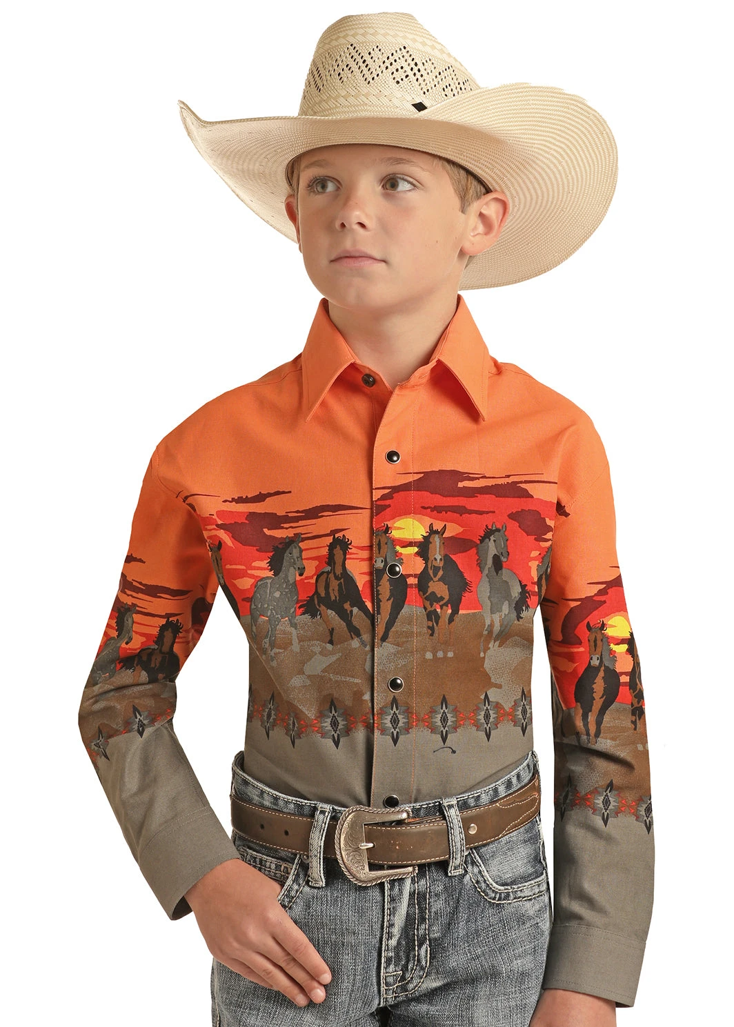 Orange and Brown Sunset Horses Border Print Long Sleeve Snap Front Shirt.