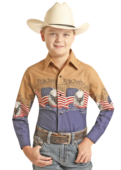 Navy and Tan with Flag and Eagle Border Print Long Sleeve Snap Front Shirt.