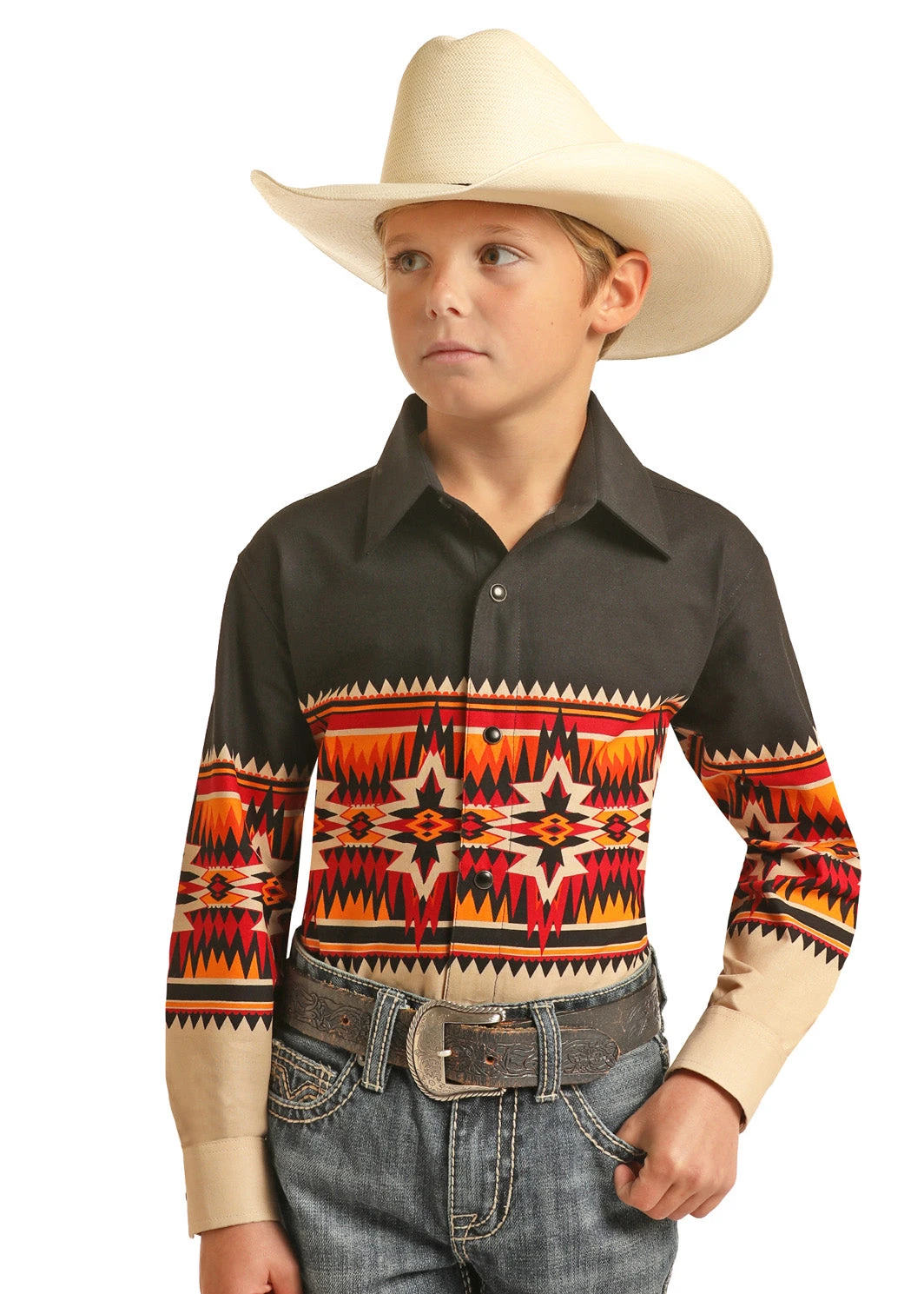 Black and Tan Long Sleeve Snap Front Shirt with Red and Orange Aztec Border Print.