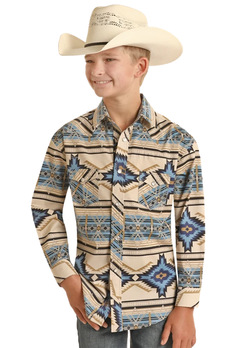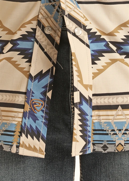 Light Tan and Blue Aztec Print Long Sleeve Snap Front Shirt.