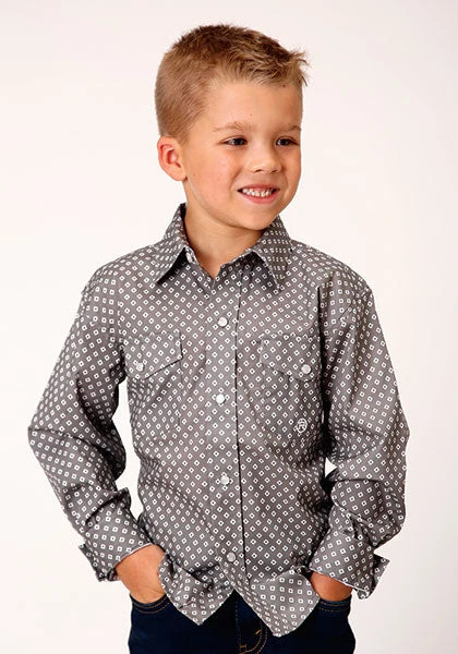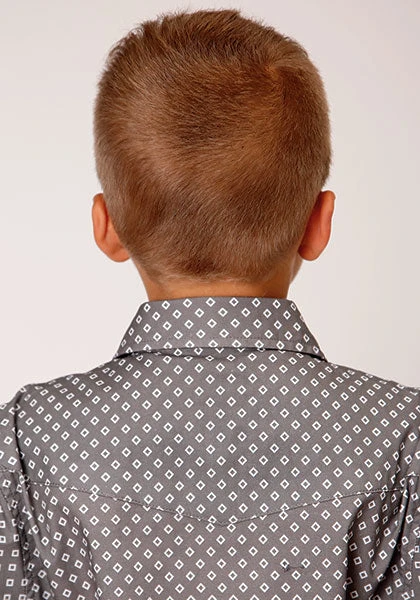 Grey and White Diamond Print Long Sleeve Snap Front Shirt.