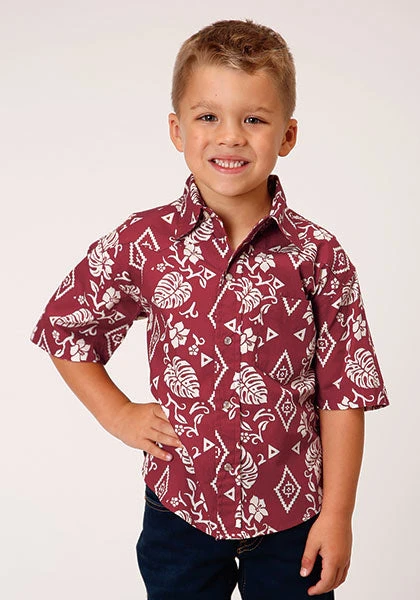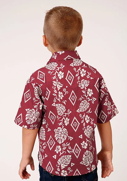 Red and White Tropics Print Short Sleeve Snap Front Shirt.