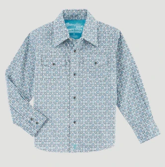 Blue Filigree Print Long Sleeve Snap Front Shirt.