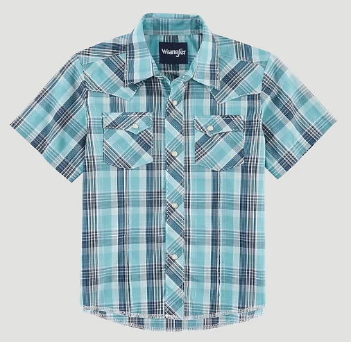 Blue Sea Plaid Short Sleeve Snap Front Shirt.