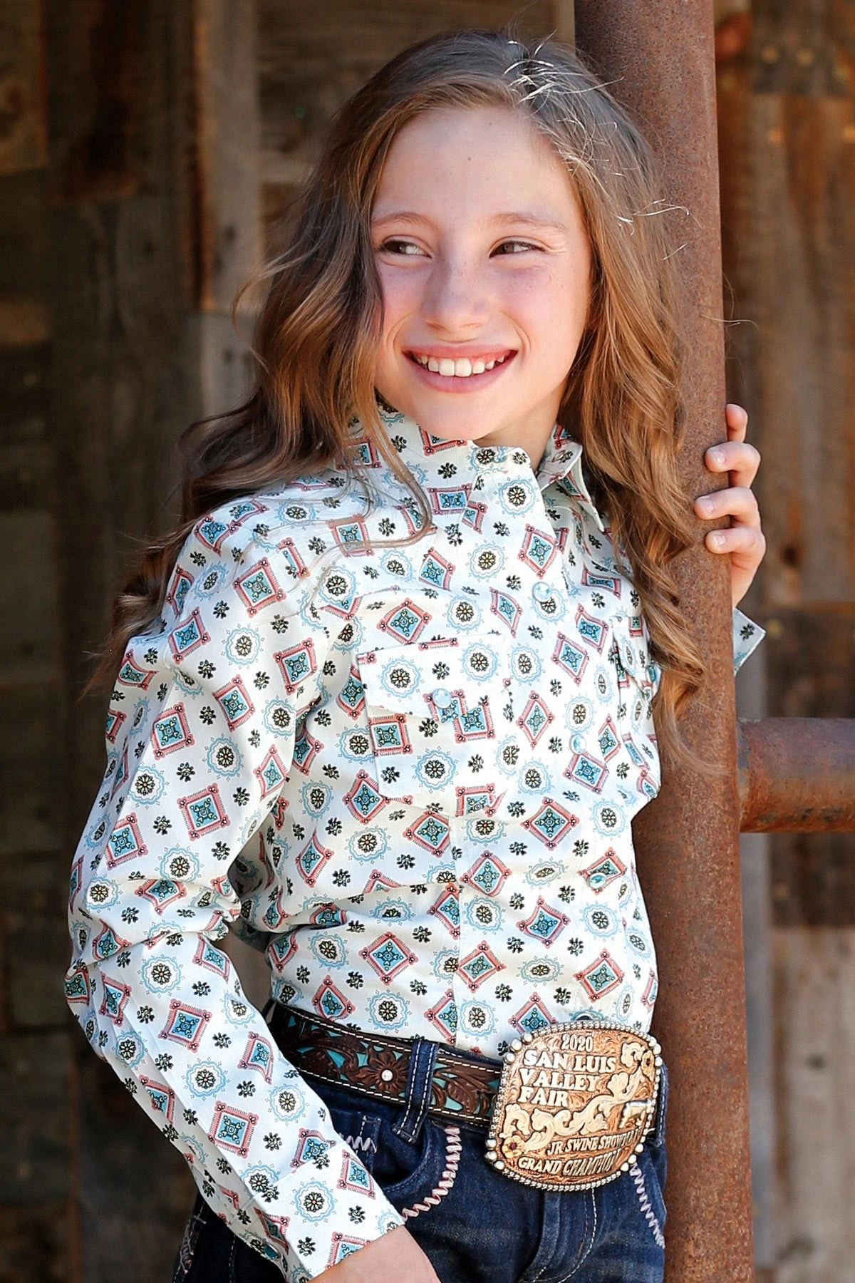 Light Blue Geometric Print Long Sleeve Snap Front Shirt.