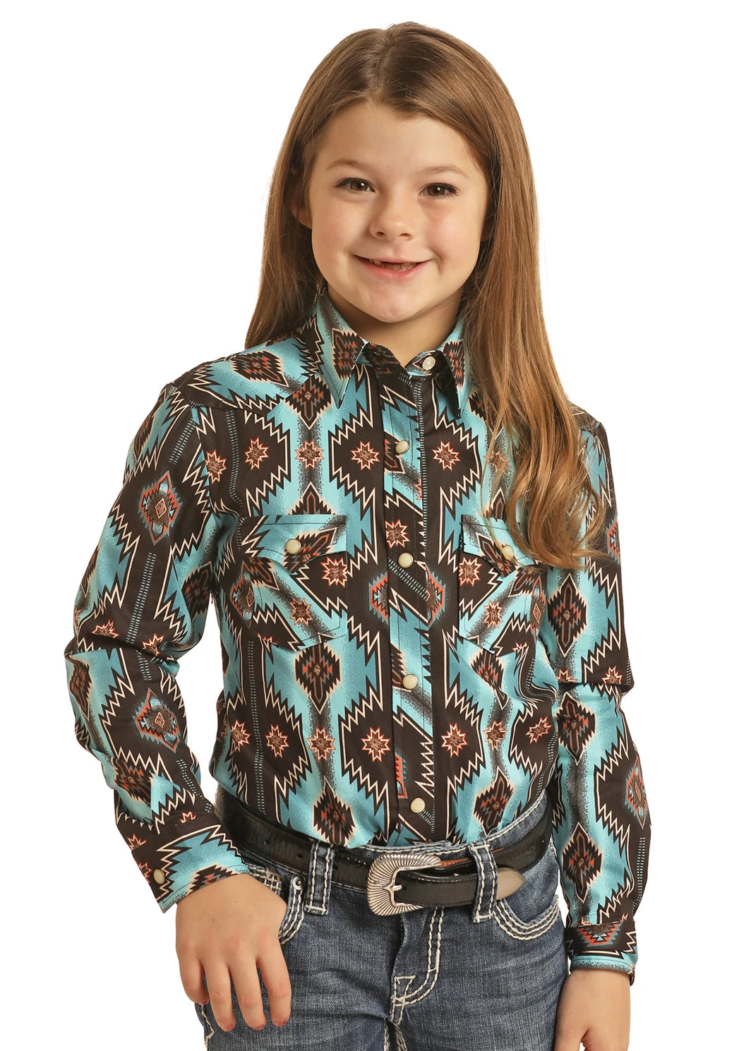 Blue and Black Aztec Long Sleeve Snap Front Shirt.