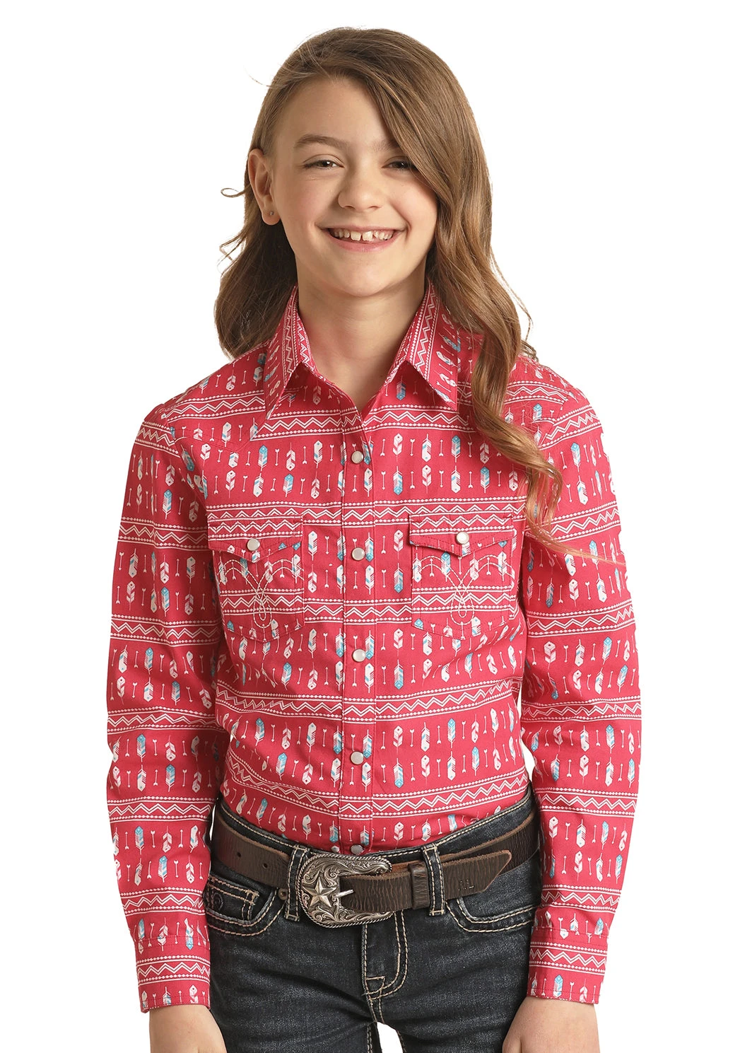 Hot Pink with Feather and White ZigZag Print Long Sleeve Snap Front Shirt.